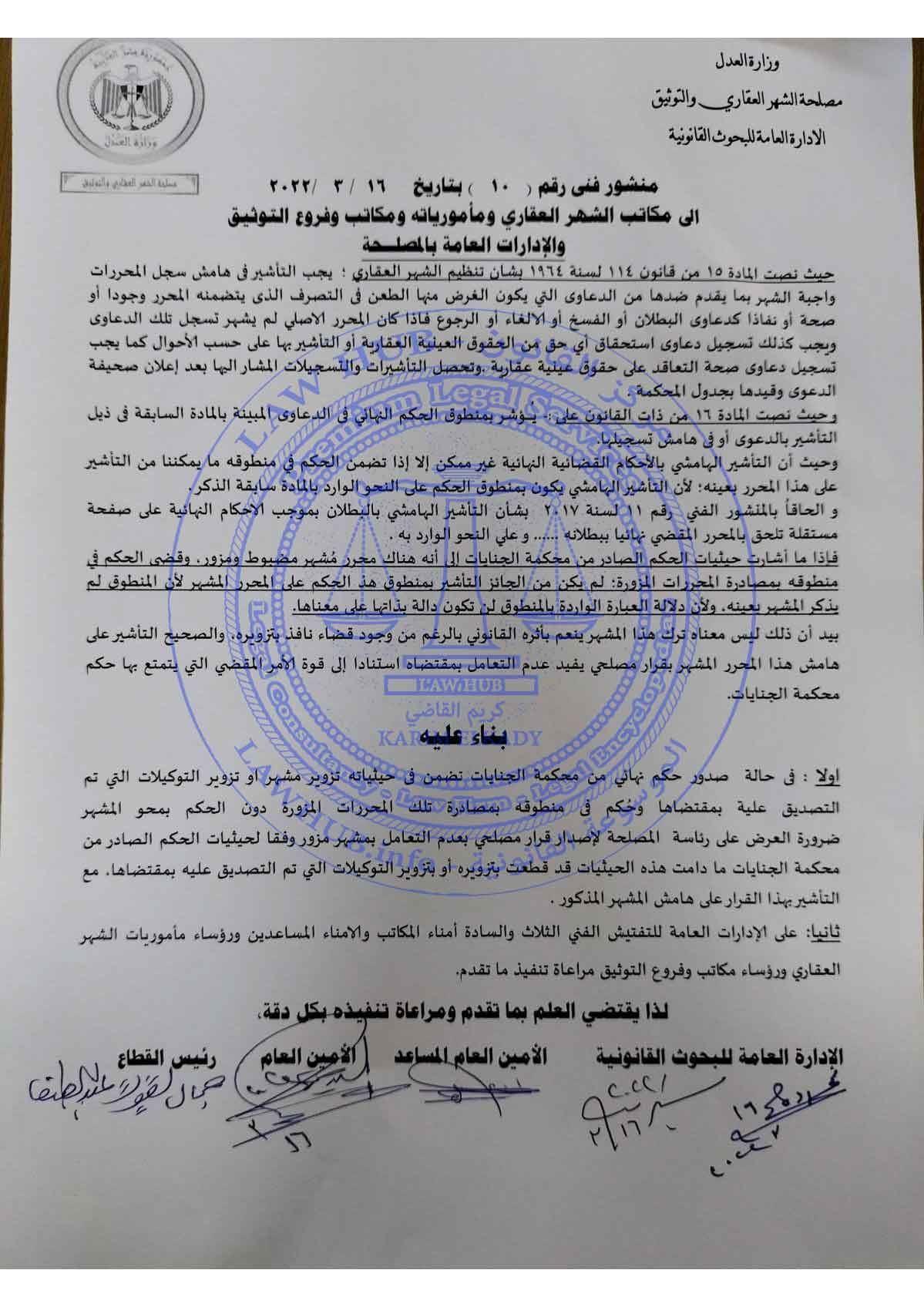 منشور فني رقم 10 لسنة 2022 الصادر من مصلحة الشهر العقاري والتوثيق