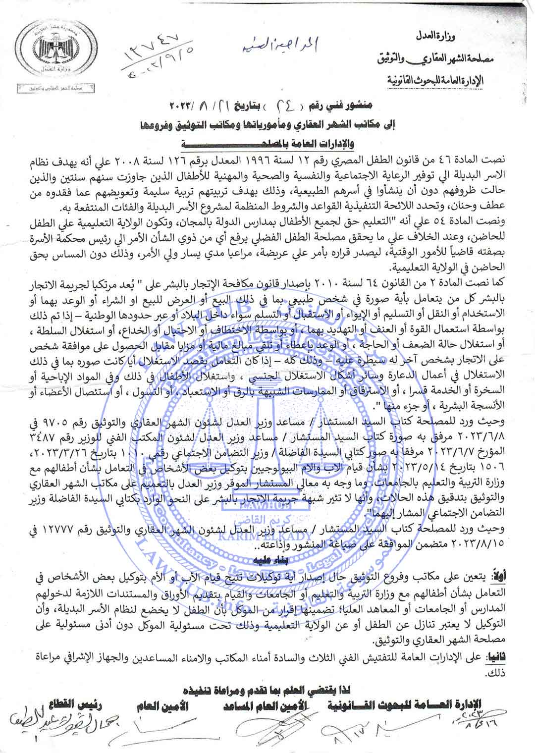 منشور فني رقم 24 لسنة 2023 الصادر من مصلحة الشهر العقاري والتوثيق