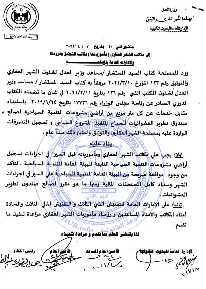 ورد للمصلحة كتاب السيد المستشار / مساعد وزير العدل لشئون الشهر العقاري والتوثيق رقم 123 المؤرخ 10/3/2021 مرفقا به كتاب السيد المستشار / مساعد وزير العدل لشئون المكتب الفني رقم 126 بتاريخ 11 / 2 / 2021 في شأن ما تضمنه الكتاب الدوري الصادر عن رئاسة مجلس الوزراء رقم 17736 بتاريخ 24/6/2019 باستيداء مقابل خدمات عن كل متر مربع من أراضي مشروعات التنمية السياحية لصالح صندوق تطوير العشوائيات للسماح بتنفيذ المشروع السياحي وتسجيل التصرفات الواردة عليه بمصلحة الشهر العقاري والتوثيق واعتبار ذلك مبدأ عام .