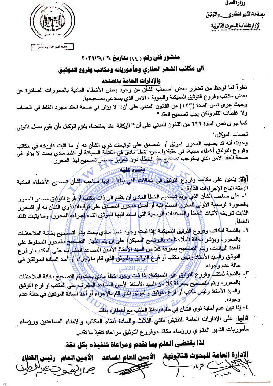 منشور فني رقم 14 لسنة 2021 الصادر من مصلحة الشهر العقاري والتوثيق
