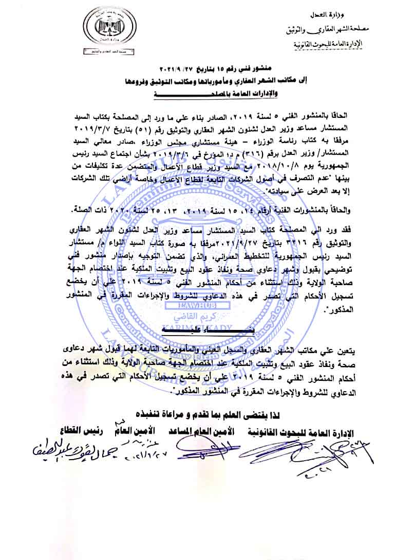 منشور فني رقم 15 لسنة 2021 الصادر من مصلحة الشهر العقاري والتوثيق