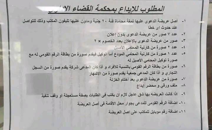 1- أصل عريضة الدعوى عليها دمغة محاماة فئة 20 جنية ومدون عليها تليفون المكتب وذلك للتواصل عند حدوث اى خطأ.
