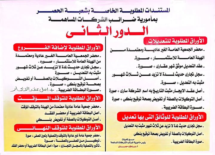 المستندات المطلوبة بشعبة الحصر بمامورية ضرائب الشركات المساهمه