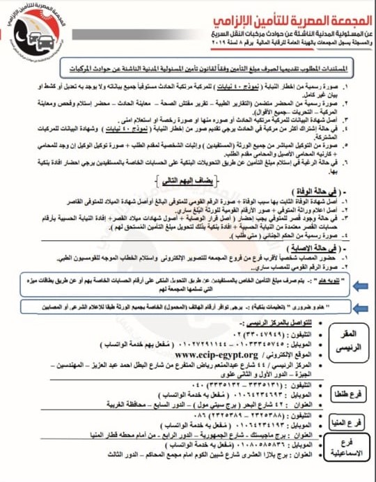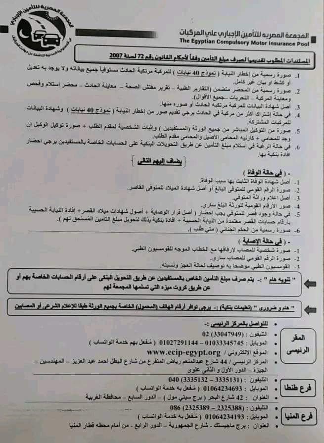 5- فى حالة وقوع الحادث من سيارة معلومة يجب تقديم شهادة بيانات السيارة موضح بها تاريخ بداية ونهاية الترخيص ووثيقة التأمين.