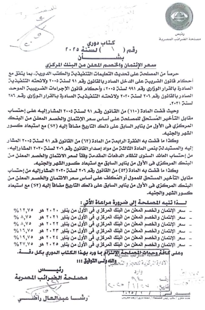 كتاب دوري رقم 1 لسنة 2025 الصادر من مصلحة الضرائب المصرية بشأن سعر الإئتمان والخصم المعلن من البنك المركزي 12 شهر ago x الرقم المرجعي: 1699 كتاب دوري رقم 1 لسنة 2025 الصادر من مصلحة الضرائب المصرية بشأن سعر الإئتمان والخصم المعلن من البنك المركزي يمكنك مشاركة المقالة من خلال تلك الايقونات #سعر الإئتمان والخصم المعلن من البنك المركزي #كتاب دوري مصلحة الضرائب رقم 1 لسنة 2025