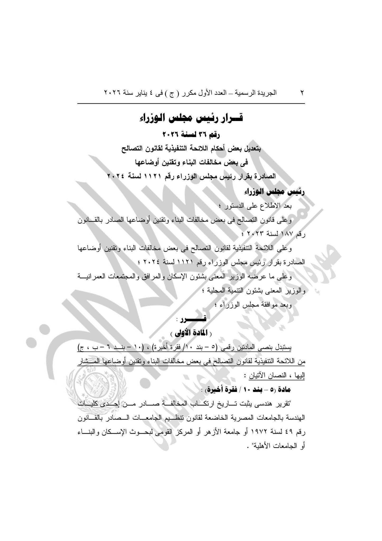 القرار رقم 36 لسنة 2026 بتعديل بعض احكام اللائحة التنفيذية لقانون التصالح في بعض مخالفات البناء يوم واحد ago كريم القاضي الرقم المرجعي: 17119 قرار رئيس مجلس الوزراء رقم 36 لسنة 2026 بتعديل بعض احكام اللائحة التنفيذية لقانون التصالح في بعض مخالفات البناء يمكنك مشاركة المقالة من خلال تلك الايقونات