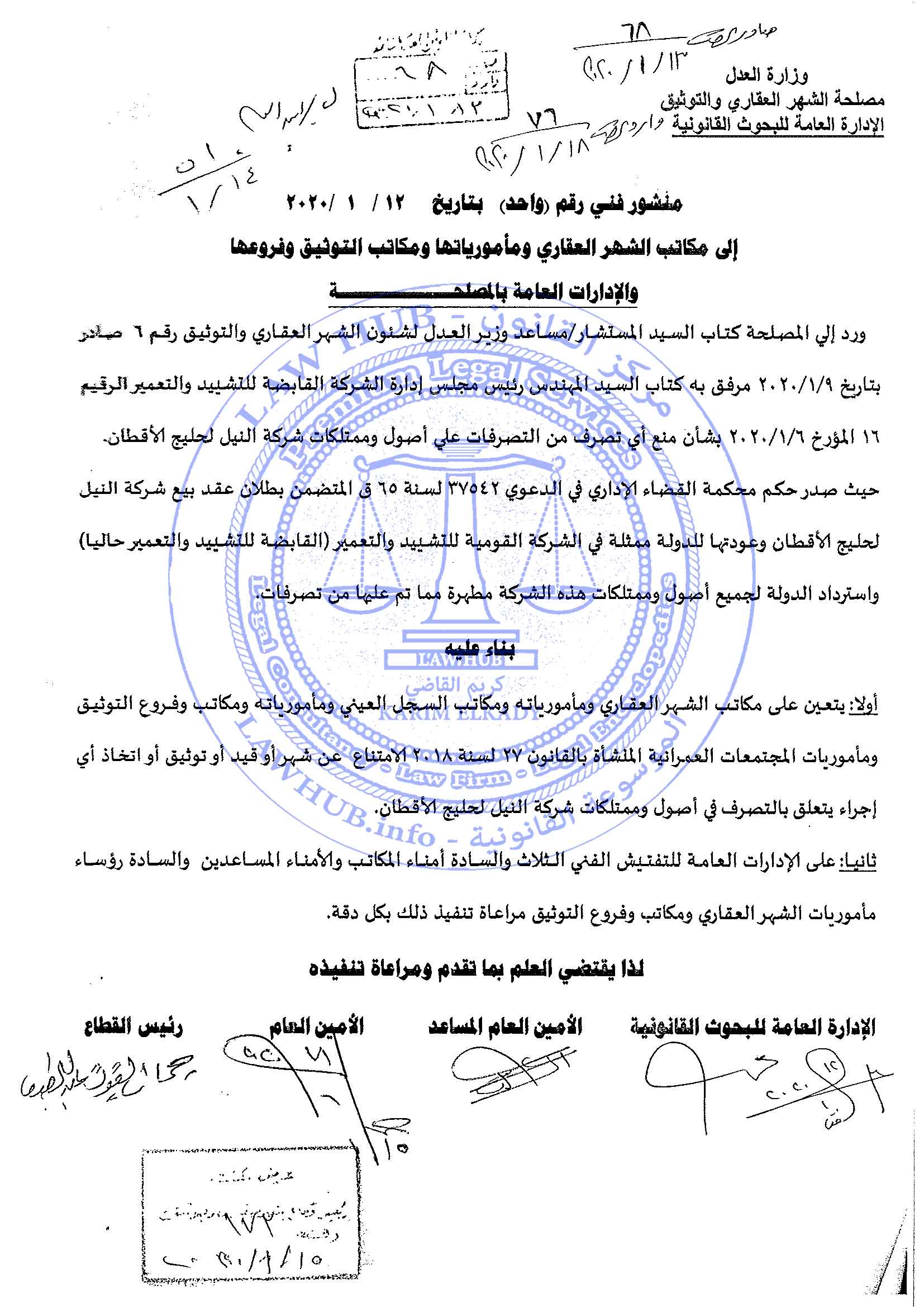 ورد إلى المصلحة كتاب السيد المستشار / مساعد وزير العدل لشئون الشهر العقاري والتوثيق رقم 6 صادر بتاريخ 9 / 1 / 2020مرفق به كتاب السيد المهندس رئيس مجلس إدارة الشركة القابضة للتشييد والتعمير الرقيم 16 المؤرخ 6 / 1 / 2020 بشان منع أي تصرف من التصرفات على أصول وممتلكات شركة النيل لحليج الأقطان .حيث صدر حكم محكمة القضاء الإداري في الدعوى 37542 لسنة 65 ق المتضمن بطلان عقد بيع شركة النيل لحليج الأقطان وعودتها للدولة ممثلة في الشركة القومية للتشييد والتعمير ( القابضة للتشييد والتعمير حاليا ) واسترداد الدولة لجميع أصول وممتلكات هذه الشركة مطهرة مما تم عليها من تصرفات .