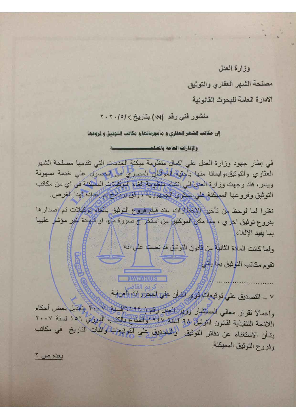 وإعمالا لقرار معالي المستشار وزير العدل رقم 6199 لسنة 2007 بتعديل بعض أحكام اللائحة التنفيذية لقانون التوثيق 68 لسنة 1947 والمذاع بالكتاب الدوري 156 لسنة 2007 بشأن الاستغناء عن دفاتر التوثيق والتصديق على التوقيعات وإثبات التاريخ في مكاتب وفروع التوثيق المميكنة .