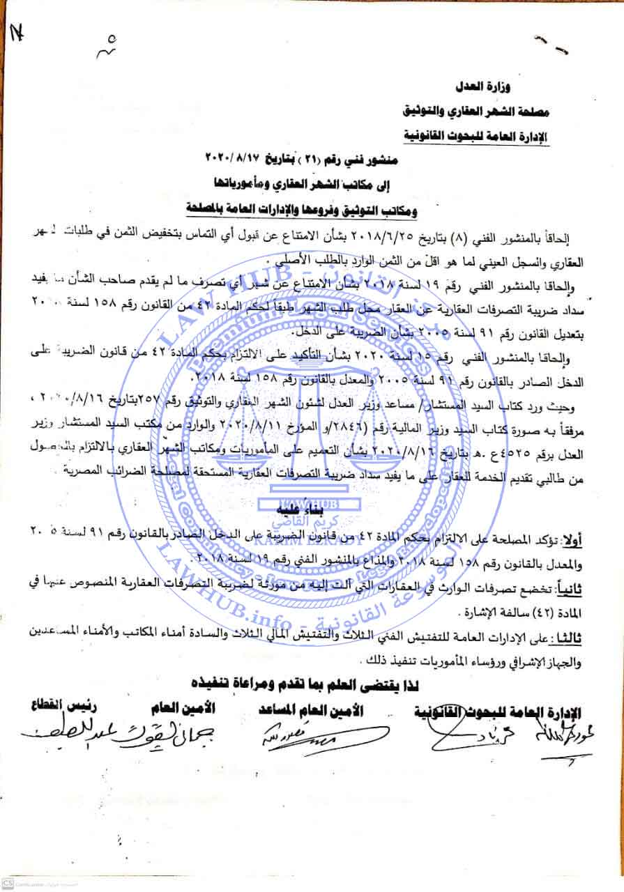إلحاقاً بالمنشور الفني رقم 8 بتاريخ 25 / 6 / 2018 بشأن الامتناع عن قبول أي التماس بتخفيض الثمن في طلبات الشهر العقاري والسجل العيني لما هو اقل من الثمن الوارد بالطلب الأصلي . وإلحاقاً بالمنشور الفني رقم 19 لسنة 2018 بشأن الامتناع عن شهر أي تصرف ما لم يقدم صاحب الشأن ما يفيد سداد ضريبة التصرفات العقارية عن العقار محل طلب الشهر ، طبقاً لحكم المادة 42 من القانون رقم 158 لسنة 2018 بتعديل القانون رقم 91 لسنة 2005 بشأن الضريبة على الدخل. وإلحاقاً بالمنشور الفني رقم 15 لسنة 2020 بشأن التأكيد على الالتزام بحكم المادة 42 من قانون الضريبة على الدخل الصادر بالقانون رقم 91 لسنة 2005 والمعدل بالقانون رقم 158 لسنة 2018 .