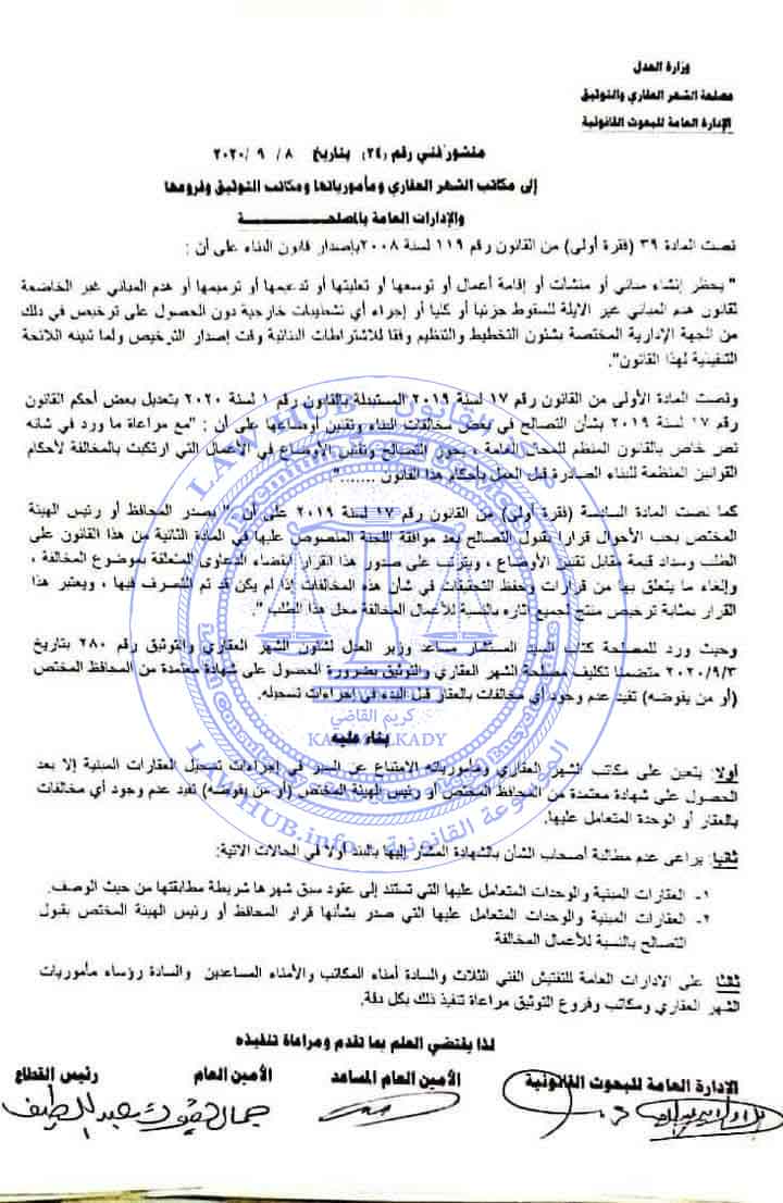 وحيث ورد للمصلحة كتاب السيد المستشار مساعد وزير العدل لشئون الشهر العقاري والتوثيق رقم 280 بتاريخ 3 / 9 / 2020 متضمنا تكليف مصلحة الشهر العقاري والتوثيق بضرورة الحصول على شهادة معتمدة من المحافظ المختص (او من يفوضه) تفيد عدم وجود أي مخالفات بالعقار قبل البدء في إجراءات تسجيله .