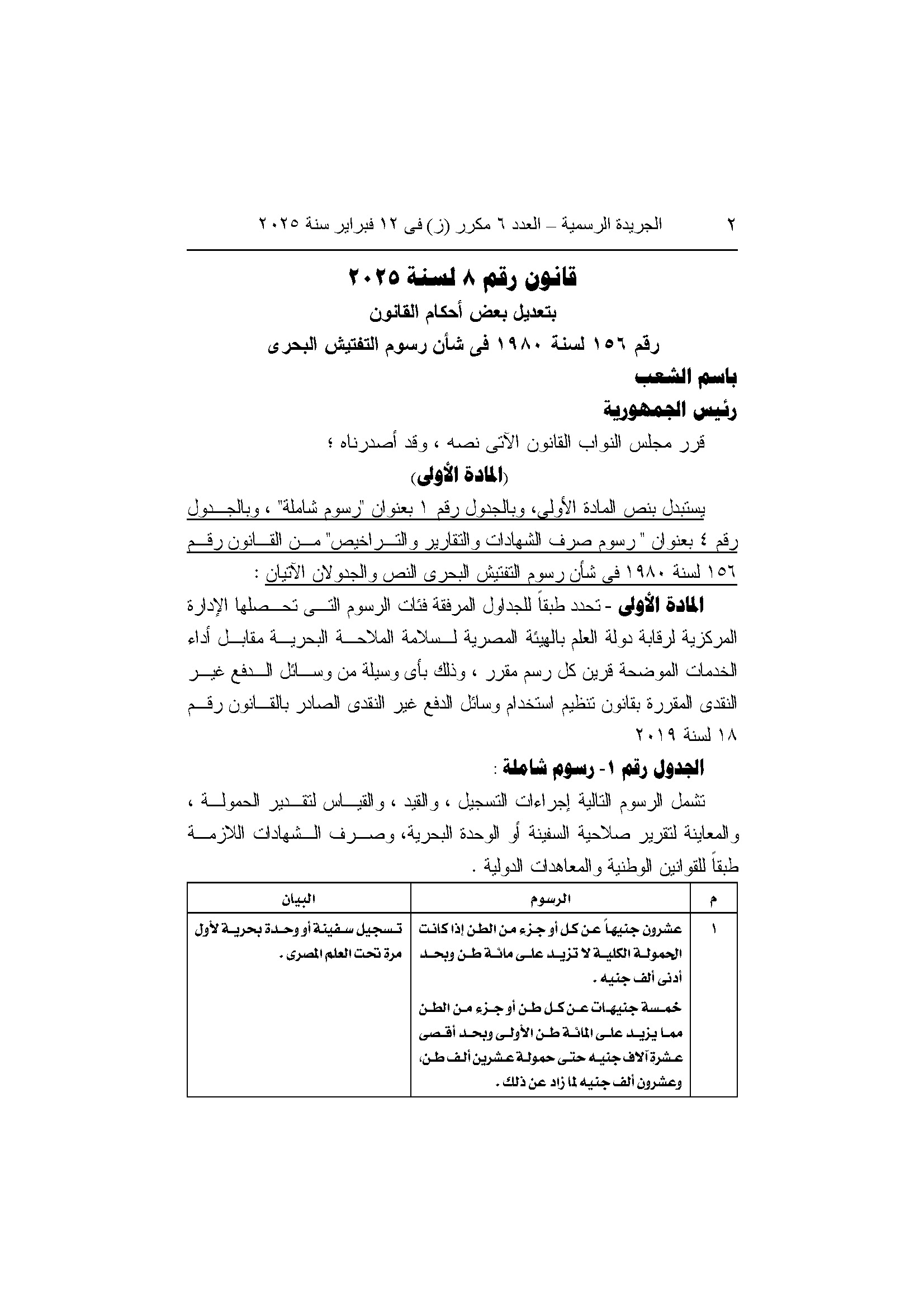 قانون رقم 8 لسنة 2025 بتعديل بعض احكام قانون رسوم التفتيش البحري 11 شهر ago x الرقم المرجعي: 3676 قانون رقم 8 لسنة 2025 بتعديل بعض احكام القانون رقم 156 لسنة 1980 في شان رسوم التفتيش البحري يمكنك مشاركة المقالة من خلال تلك الايقونات #تعديل قانون رسوم التفتيش البحري #تعديل قانون رقم 156 لسنة 1980 #رسوم التفتيش البحري #قانون 8 لسنة 2025