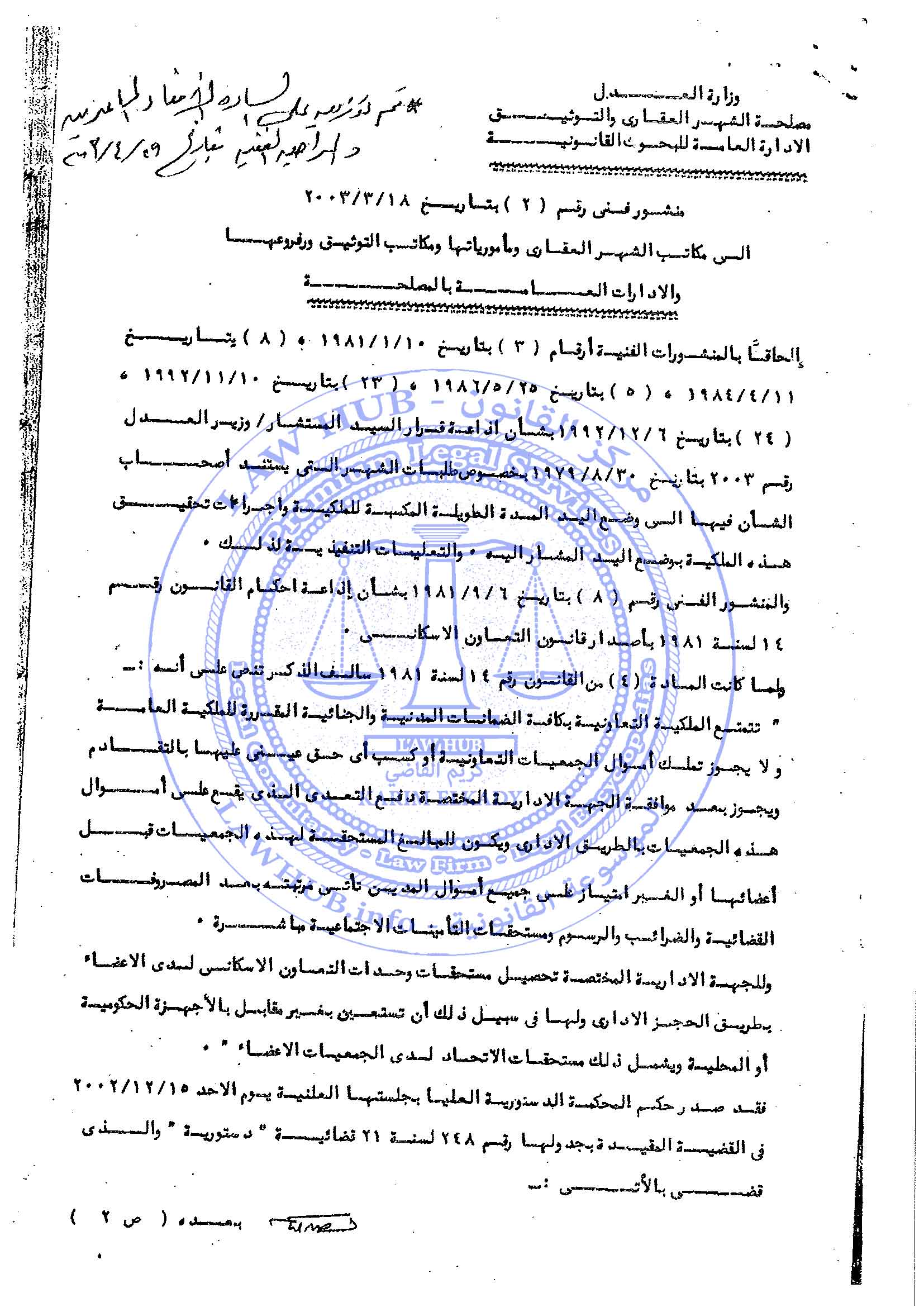 منشور فني رقم 2 لسنة 2003 الصادر من مصلحة الشهر العقاري والتوثيق 23 سنة ago x الرقم المرجعي: 4089 منشور الشهر العقاري رقم 2 لسنة 2003 يمكنك مشاركة المقالة من خلال تلك الايقونات #منشور الشهر العقاري رقم 2 لسنة 2003