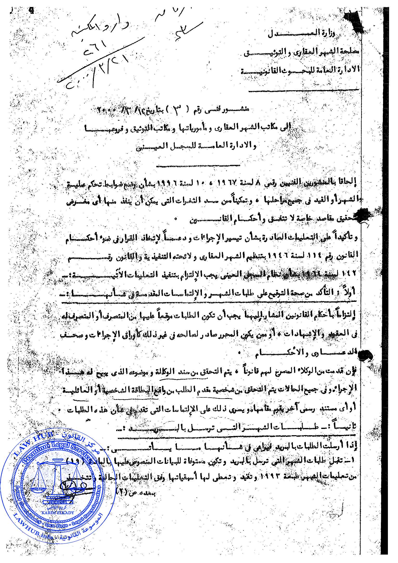 منشور فني رقم 3 لسنة 2000 الصادر من مصلحة الشهر العقاري والتوثيق 26 سنة ago x الرقم المرجعي: 4228 منشور الشهر العقاري رقم 3 لسنة 2000 يمكنك مشاركة المقالة من خلال تلك الايقونات #منشور الشهر العقاري رقم 3 لسنة 2000