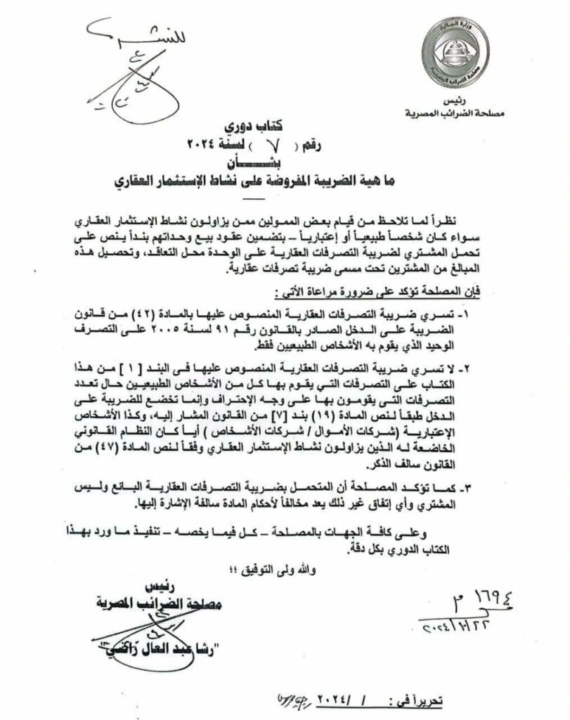 كتاب دوري رقم ٧ لسنة ٢٠٢٤ صادر من مصلحة الضرائب المصريه بشأن سداد ضريبة التصرفات العقاريه للأفراد و الشركات