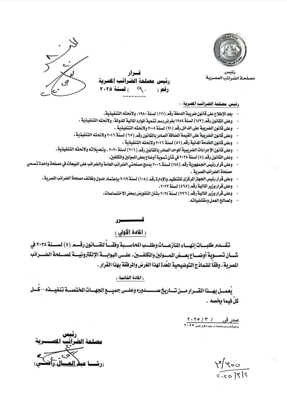 قرار رقم 90 لسنة 2025 الصادر من مصلحة الضرائب المصرية بشأن نشر نماذج طلبات انهاء المنازعات وطلب المحاسبة 11 شهر ago x الرقم المرجعي: 4663 قرار رقم 90 لسنة 2025 الصادر من مصلحة الضرائب المصرية بنشر نماذج طلبات انهاء المنازعات وطلب المحاسبة وفقاً للقانون 5 لسنة 2025 في شأن تسوية أوضاع بعض الممولين والمكلفين يمكنك مشاركة المقالة من خلال تلك الايقونات #قرار الضرائب رقم 90 لسنة 2025 #قرار رئيس مصلحة الضرائب رقم 90 لسنة 2025 #قرار رقم 90 لسنة 2025 #نماذج القانون رقم 5 لسنة 2025