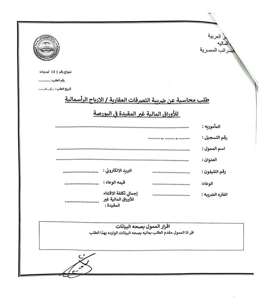 نموذج رقم (2): طلب محاسبة عن ضريبة التصرفات العقارية / الأرباح الرأسمالية للأوراق المالية غير المقيدة بالبورصة.
