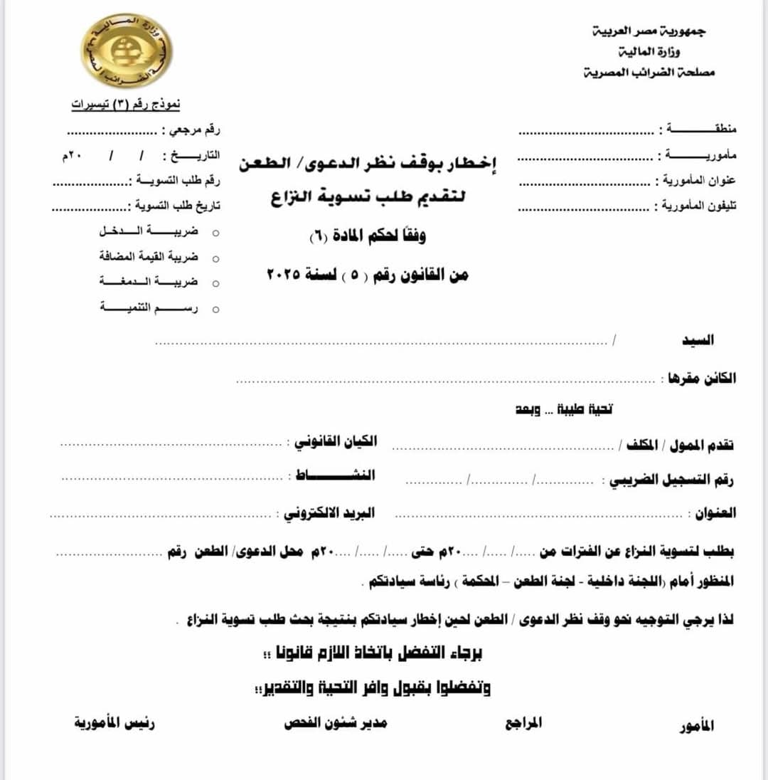 نموذج رقم (3): إخطار بوقف نظر الدعوى / الطعن لتقديم طلب تسوية النزاع وفقا لحكم المادة (6) من القانون رقم (5) لعام 2025