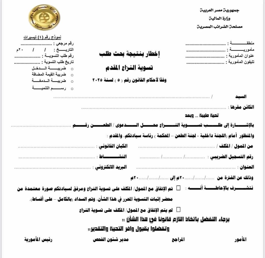 نموذج رقم (4) : إخطار بنتيجة بحث طلب تسوية النزاع المقدم وفقا لأحكام القانون رقم 5 لسنة 2025.