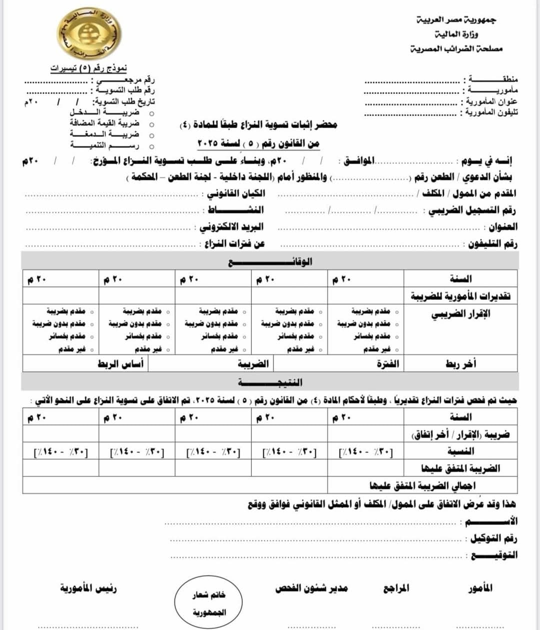 نموذج رقم (5): محضر إثبات تسوية النزاع طبقا للمادة (4) من القانون رقم (5) لعام 2025