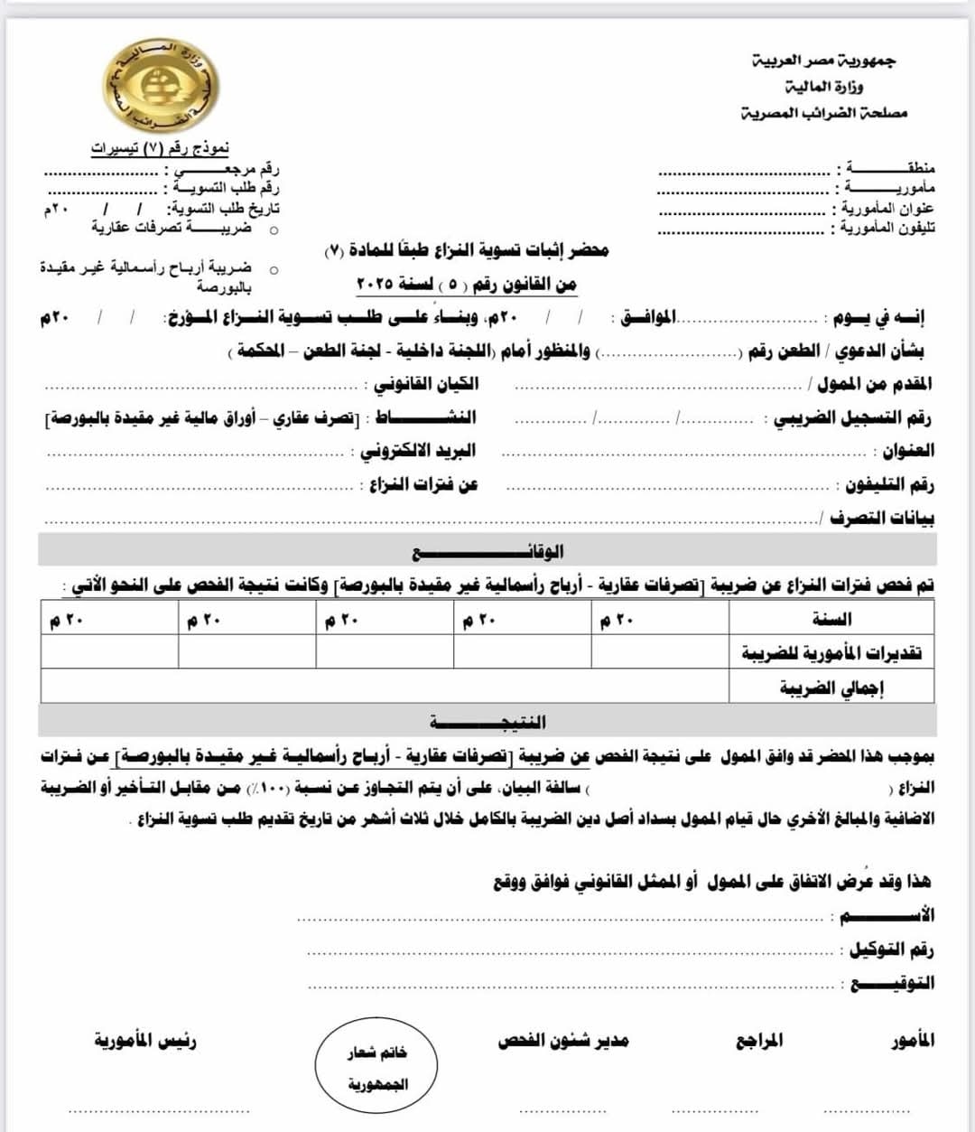 نموذج رقم (7) : محضر إثبات تسوية النزاع طبقاً للمادة (7) من القانون رقم (5) لعام 2025.