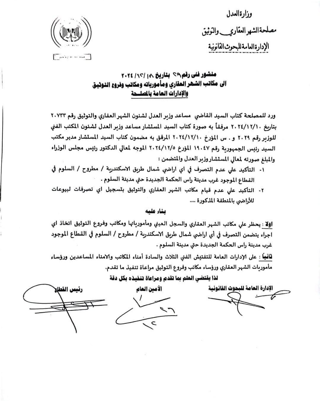 منشور فنى رقم ٢٩ لسنة ٢٠٢٤ الصادر من مصلحة الشهر العقارى بالحظر علي مكاتب الشهر العقاري والسجل العيني ومأمورياتها ومكاتب وفروع التوثيق اتخاذ اي اجراء يتضمن التصرف في أي اراضي شمال طريق الاسكندرية / مطروح / السلوم في القطاع الموجود غرب مدينة راس الحكمة الجديدة حتي مدينة السلوم .