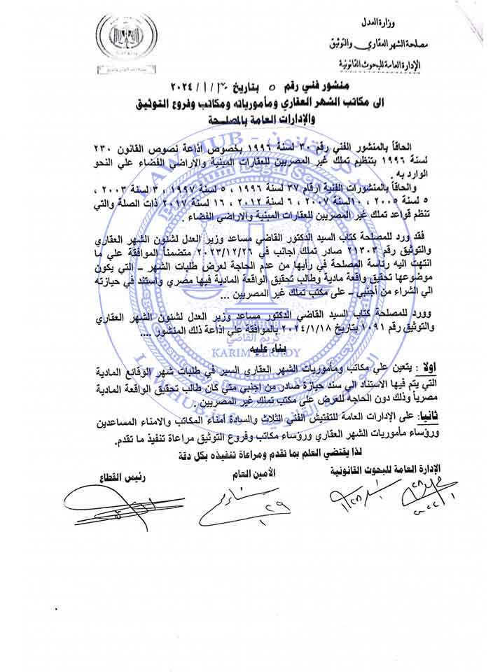 وإلحاقاً بالمنشورات الفنية أرقام 37 لسنة 1996 ، 5 لسنة 1997 ، 3 لسنة 2003 ، 5 لسنة 2005 ، 10 لسنة 2007 ، 6 لسنة 2012 ، 19 لسنة 2017 ذات الصلة والتي تنظم قواعد تملك غير المصريين للعقارات المبنية والأراضي الفضاء .