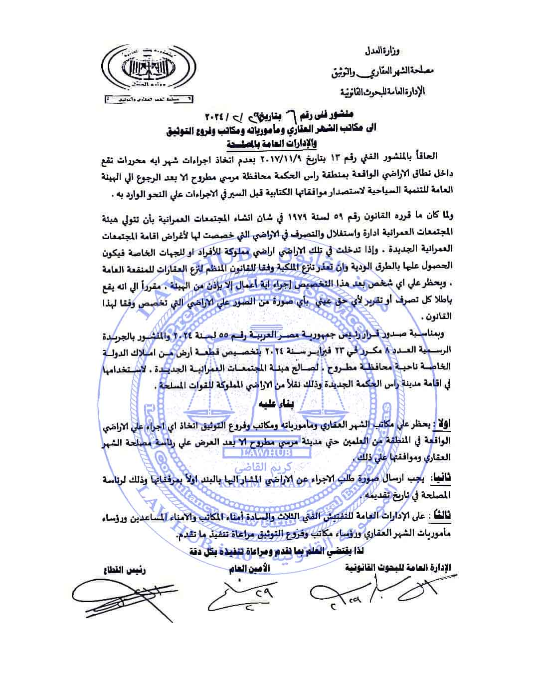 إلحاقاً بالمنشور الفني رقم 13 بتاريخ 9 / 11 / 2017 بعدم اتخاذ إجراءات شهر أية محررات تقع داخل نطاق الأراضي الواقعة بمنطقة رأس الحكمة محافظة مرسي مطروح إلا بعد الرجوع إلى الهيئة العامة للتنمية السياحية لاستصدار موافقاتها الكتابية قبل السير في الإجراءات على النحو الوارد به .
