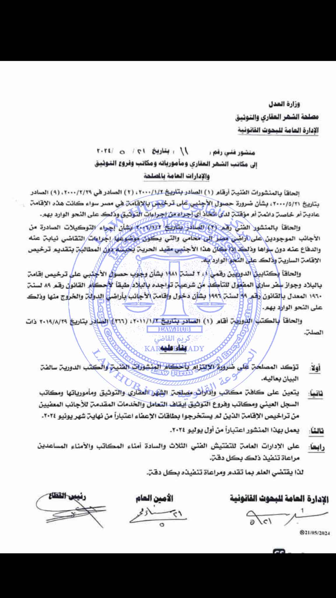 الحاقاً بالمنشورات الفنية أرقام (۱) الصادر بتاريخ ۱/۲/ ۲۰۰۰ ، (۲) الصادر في ۲۰۰۰/۲/۲۹، (۹) الصادر بتاريخ ۲۰۰۰/٥/۲۱ ، بشأن ضرورة حصول الأجنبي على ترخيص بالإقامة في مصر سواء كانت هذه الإقامة عادية أو خاصة دائمة أم مؤقتة لدى اتخاذ أي إجراء من إجراءات التوثيق وذلك على النحو الوارد بهم.