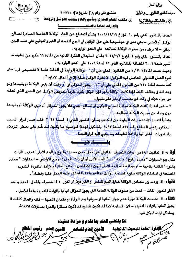 إلحاقاً بالمنشور الفني رقم ۱۰ المؤرخ 19 /11 / 2001 بشأن الامتناع عن إلغاء الوكالة الخاصة الصادرة لصالح الوكيل أو لأجنبي – متي نص في موضوعها على حق الوكيل في البيع لنفسه أو الغير والتوقيع على عقد البيع النهائي – إلا برضاء من صدرت الوكالة لصالحه على النحو الوارد به .